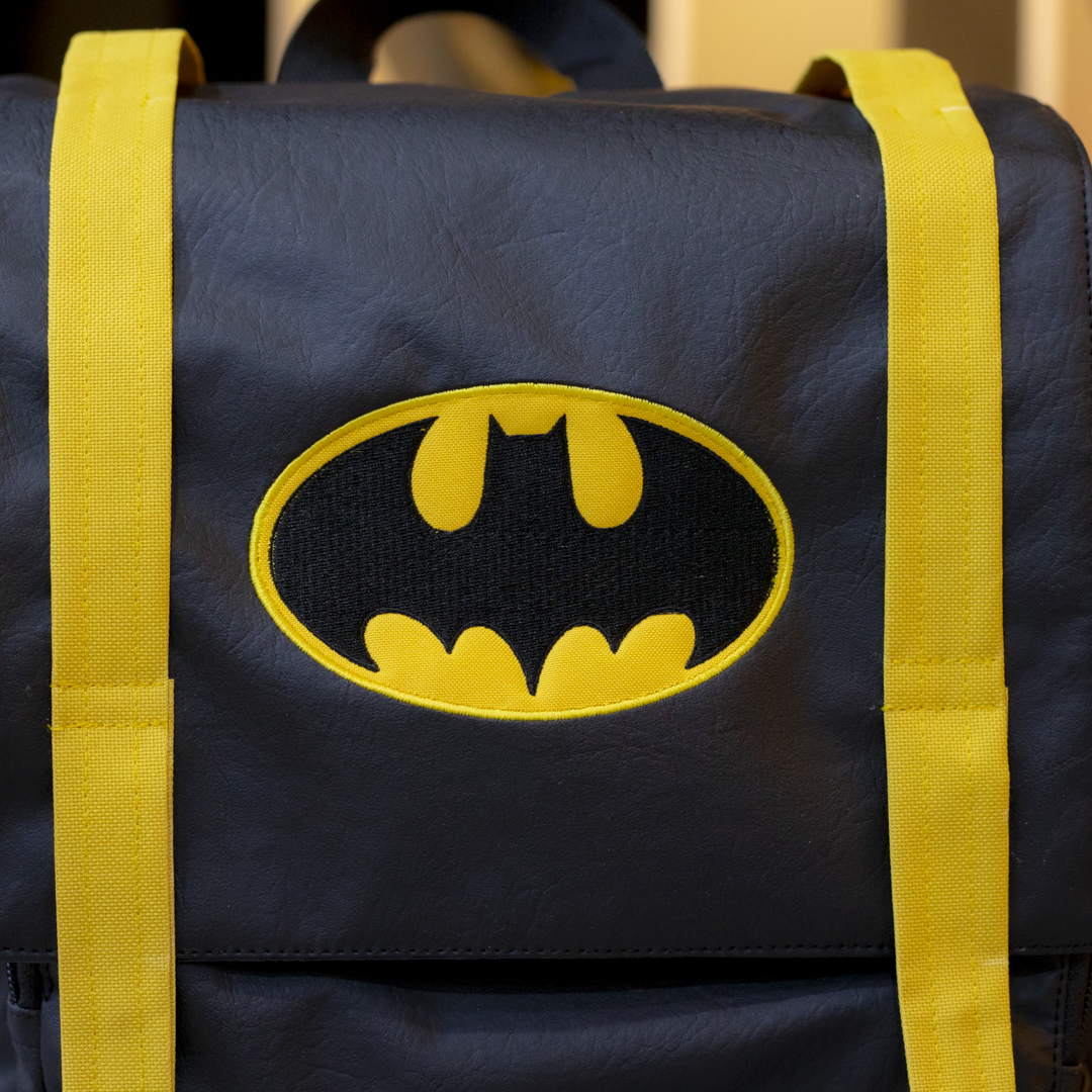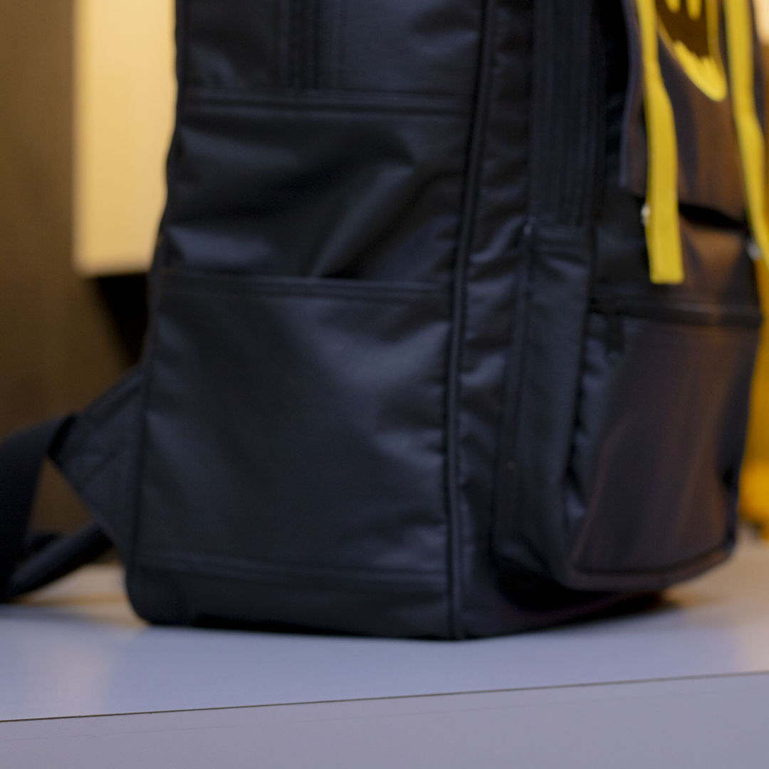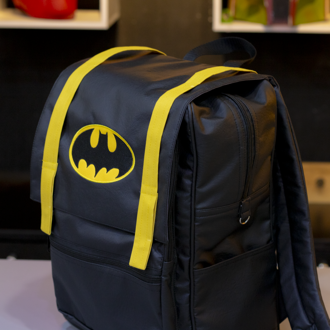 Esta mochila inspirada en el Caballero de la Noche luce el icónico logo amarillo y negro en el centro, sobre un elegante fondo negro.