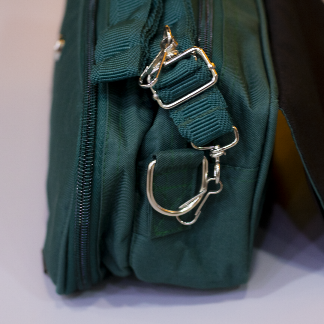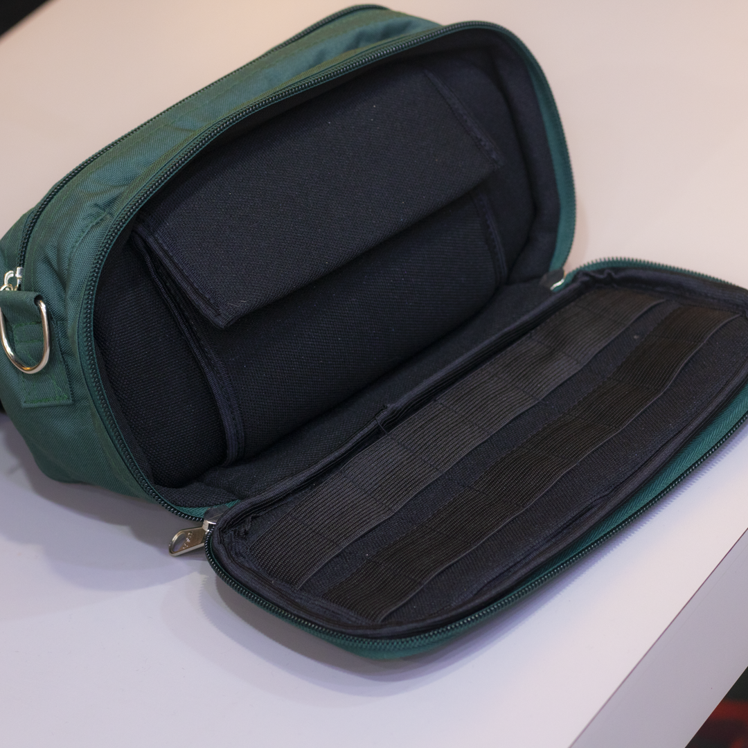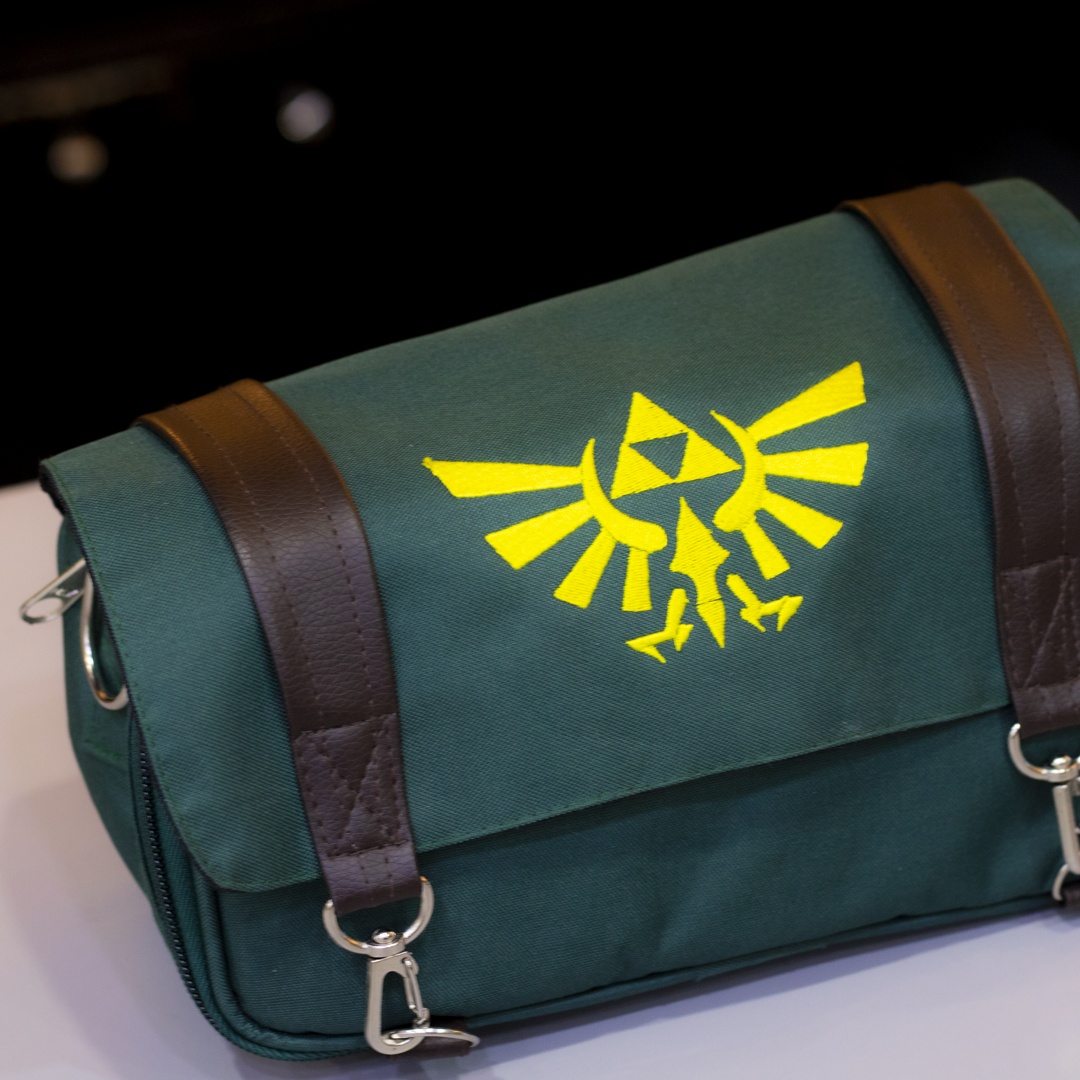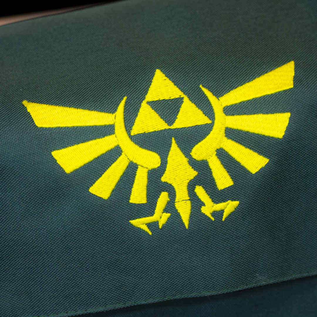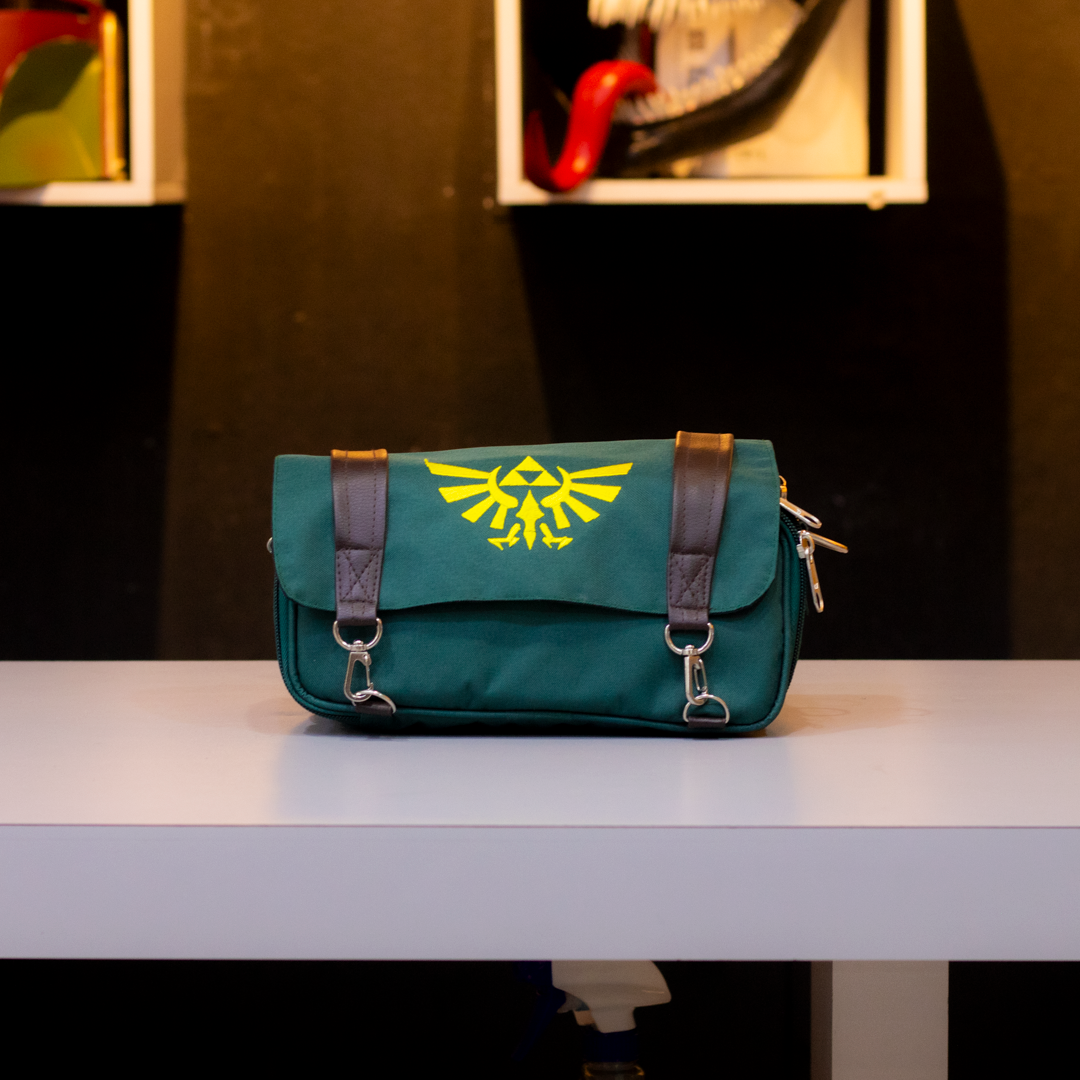 ¡Directo desde los campos de Hyrule! Este porta Switch en forma de mochila color verde, con la Trifuerza bordada al frente, rinde homenaje al legendario traje del Héroe del Tiempo.