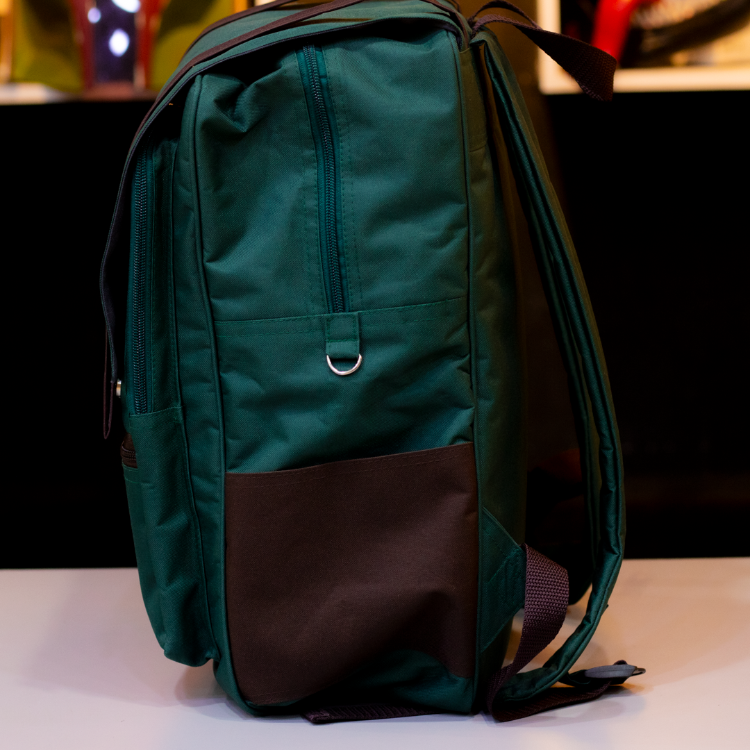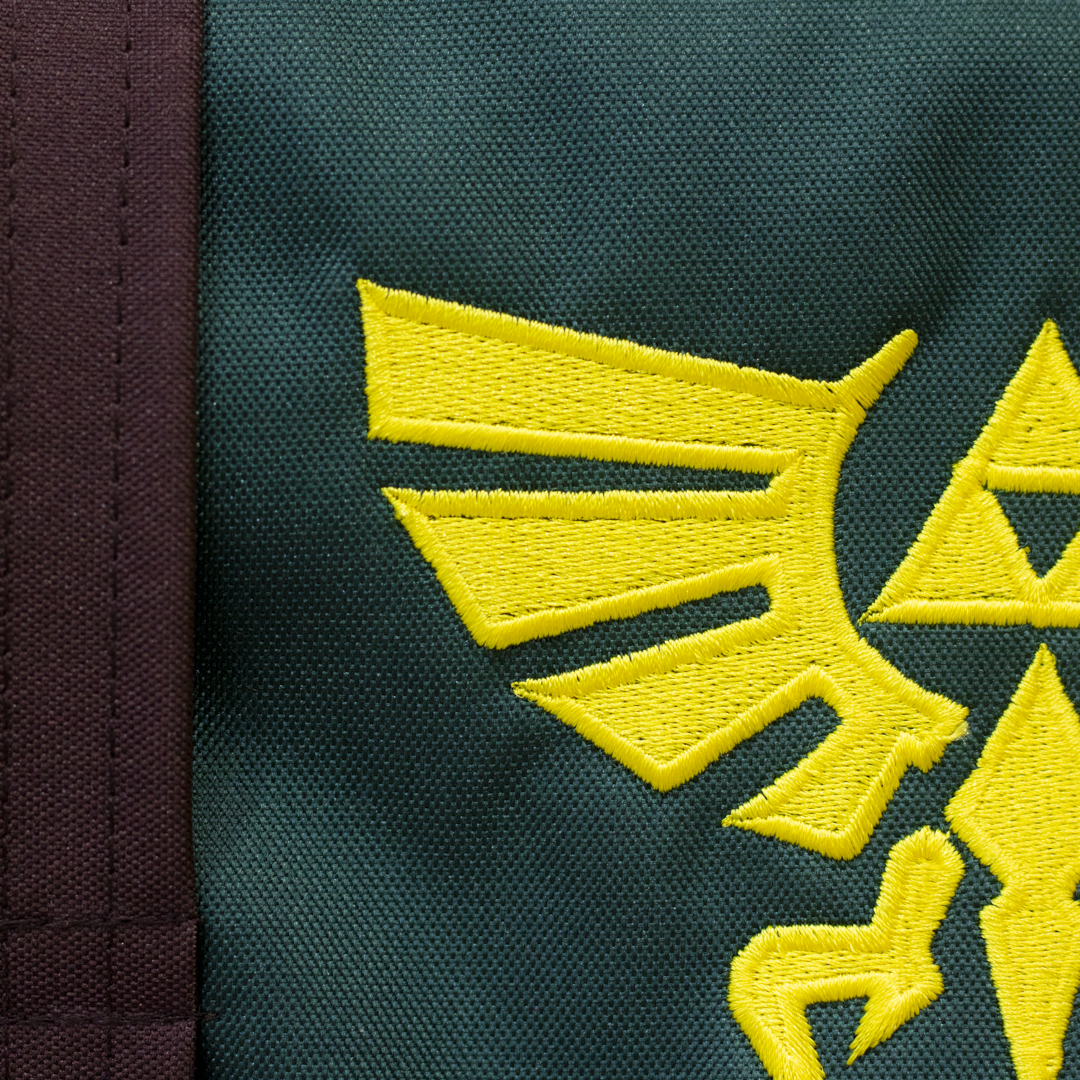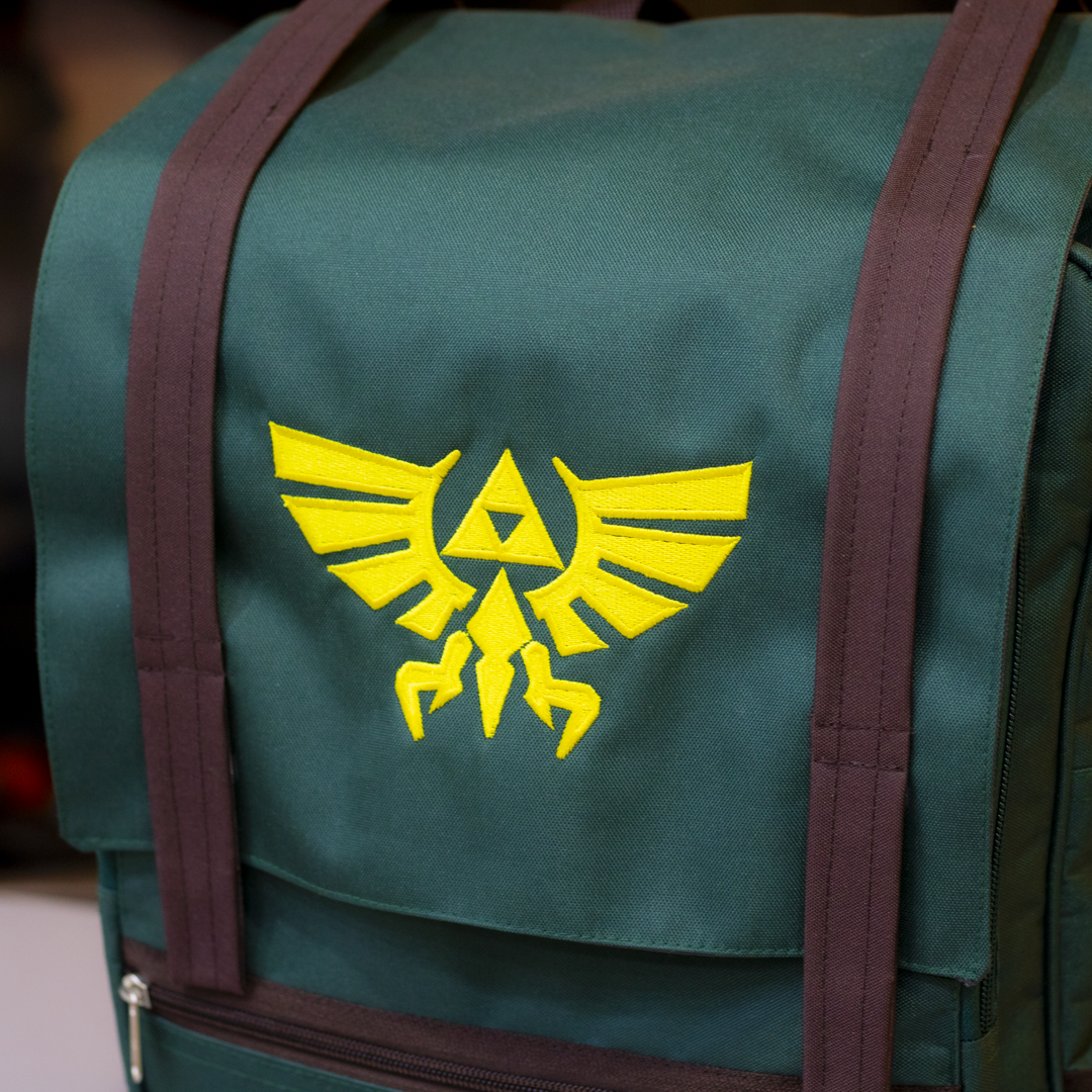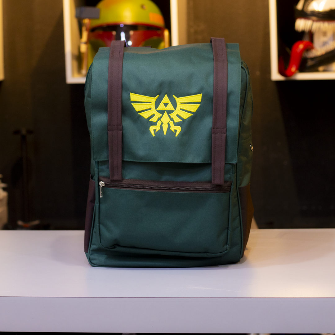 ¿Listo para tu próxima misión? Esta mochila verde con correas cafés y el emblema dorado de la Trifuerza evoca la legendaria túnica del Héroe del Tiempo.