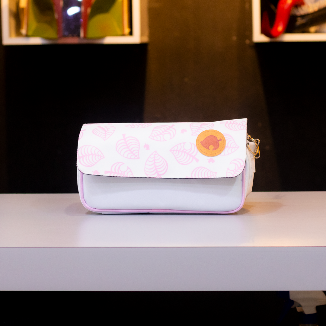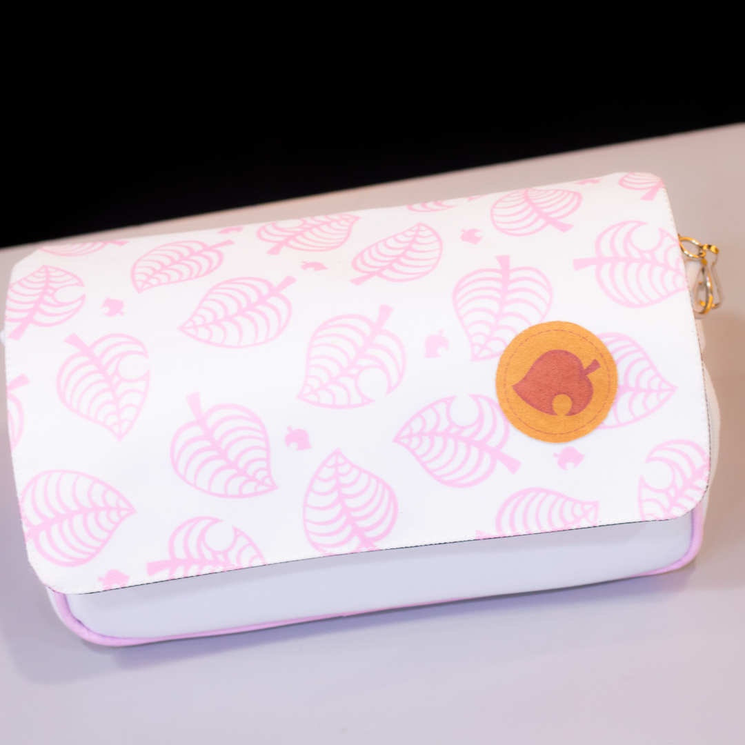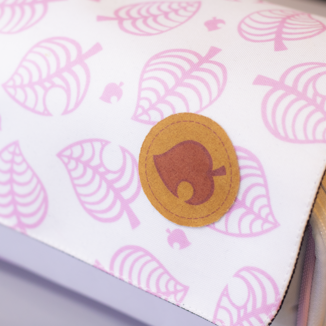 Este porta Switch rosado está inspirado en Animal Crossing, con el clásico logo de la hoja troquelado en cuero al frente y estampados icónicos del juego que te harán sentir como en tu propia isla, aunque estés en el tráfico.