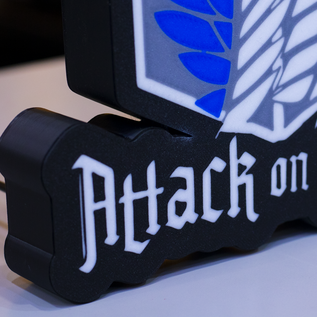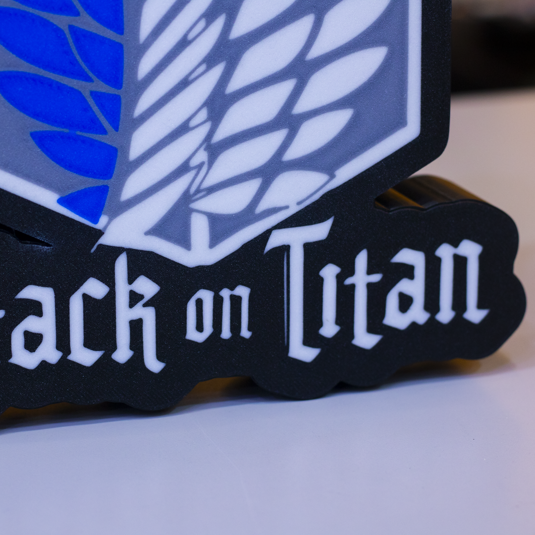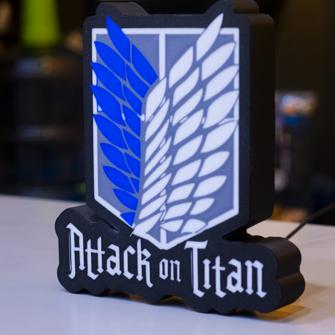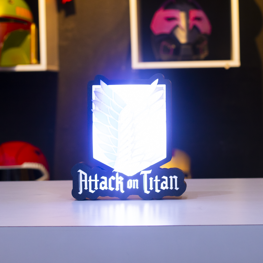 Por la libertad, por la humanidad. Esta lámpara impresa en 3D lleva el emblema de la Legión de Reconocimiento, también conocidas como Alas de la Libertad, símbolo de valentía en Attack on Titan. Con luz LED cálida y un diseño detallado, es el tributo perfecto para quienes no temen mirar más allá de los muros.