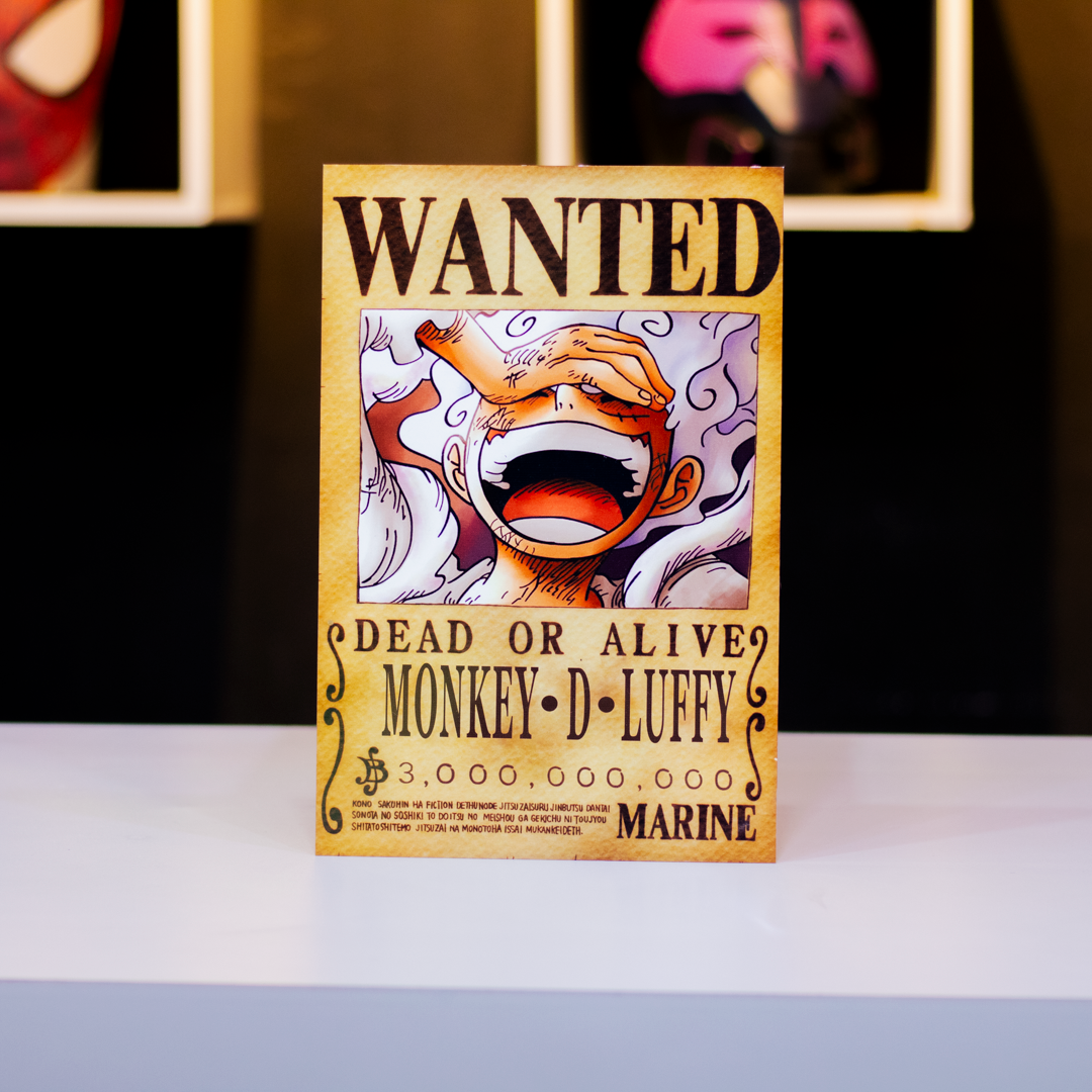 Este cuadro metálico estilo WANTED de 20x30 cm inmortaliza a Monkey D. Luffy en su Gear 5, el despertar definitivo que lo convirtió en la encarnación de la alegría y el caos.