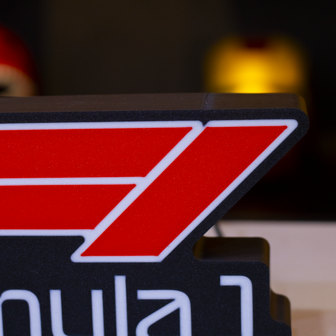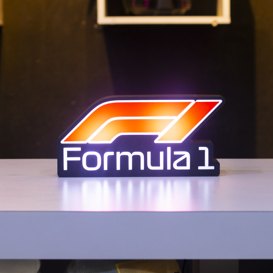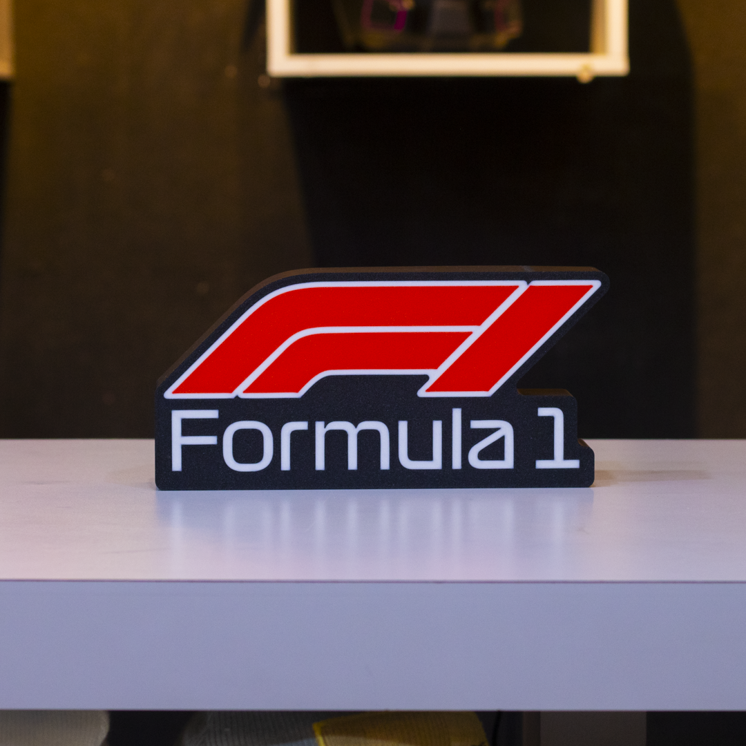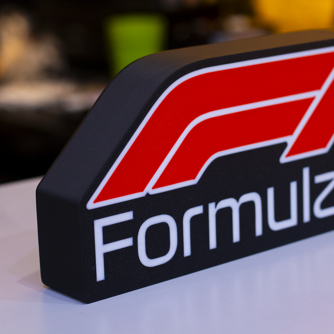 Esta lámpara impresa en 3D reproduce el emblemático logo de la Fórmula 1, perfecta para fans del automovilismo que quieren iluminar su pasión por las pistas.