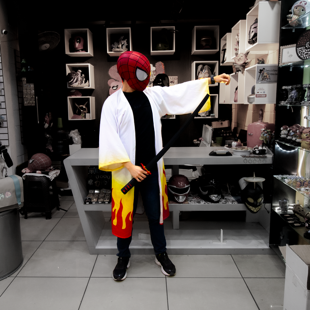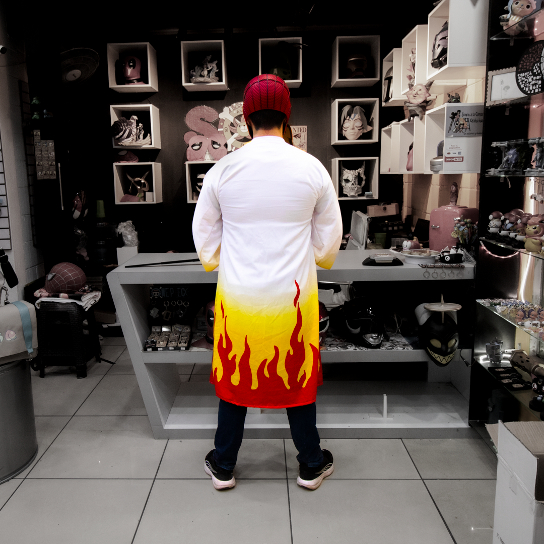 Este haori inspirado en Kyojuro Rengoku de Kimetsu no Yaiba reproduce el icónico diseño de llamas que representa la pasión, el coraje y el espíritu inquebrantable del Pilar de la Llama. Una prenda única para destacar en cosplay, exhibición o para llevar tu fanatismo con orgullo.
