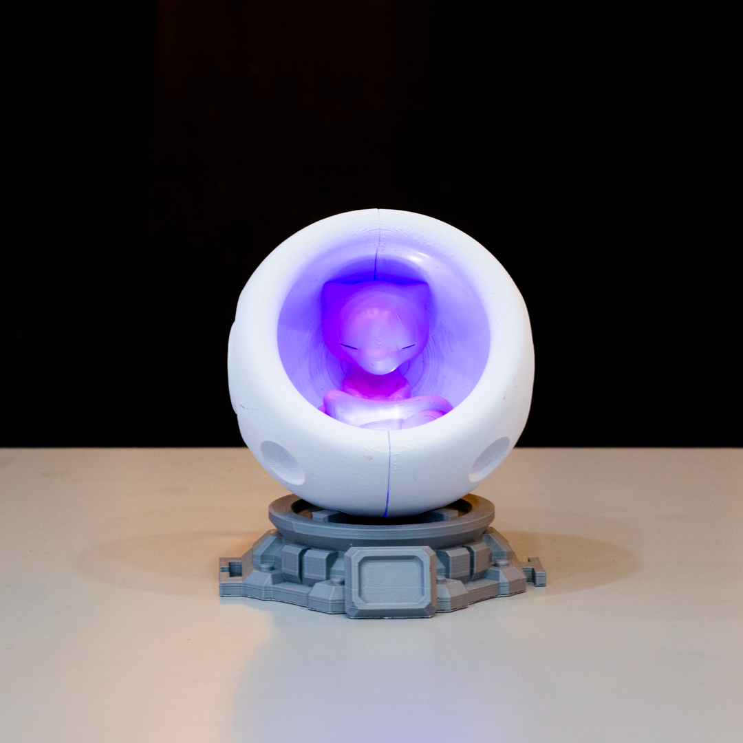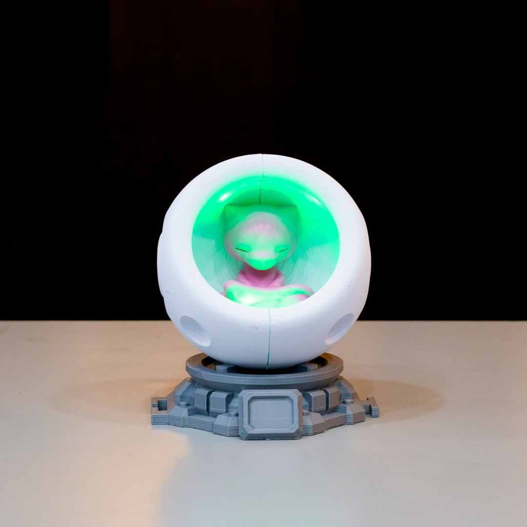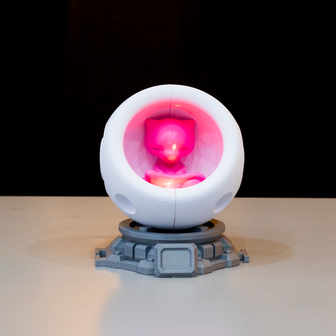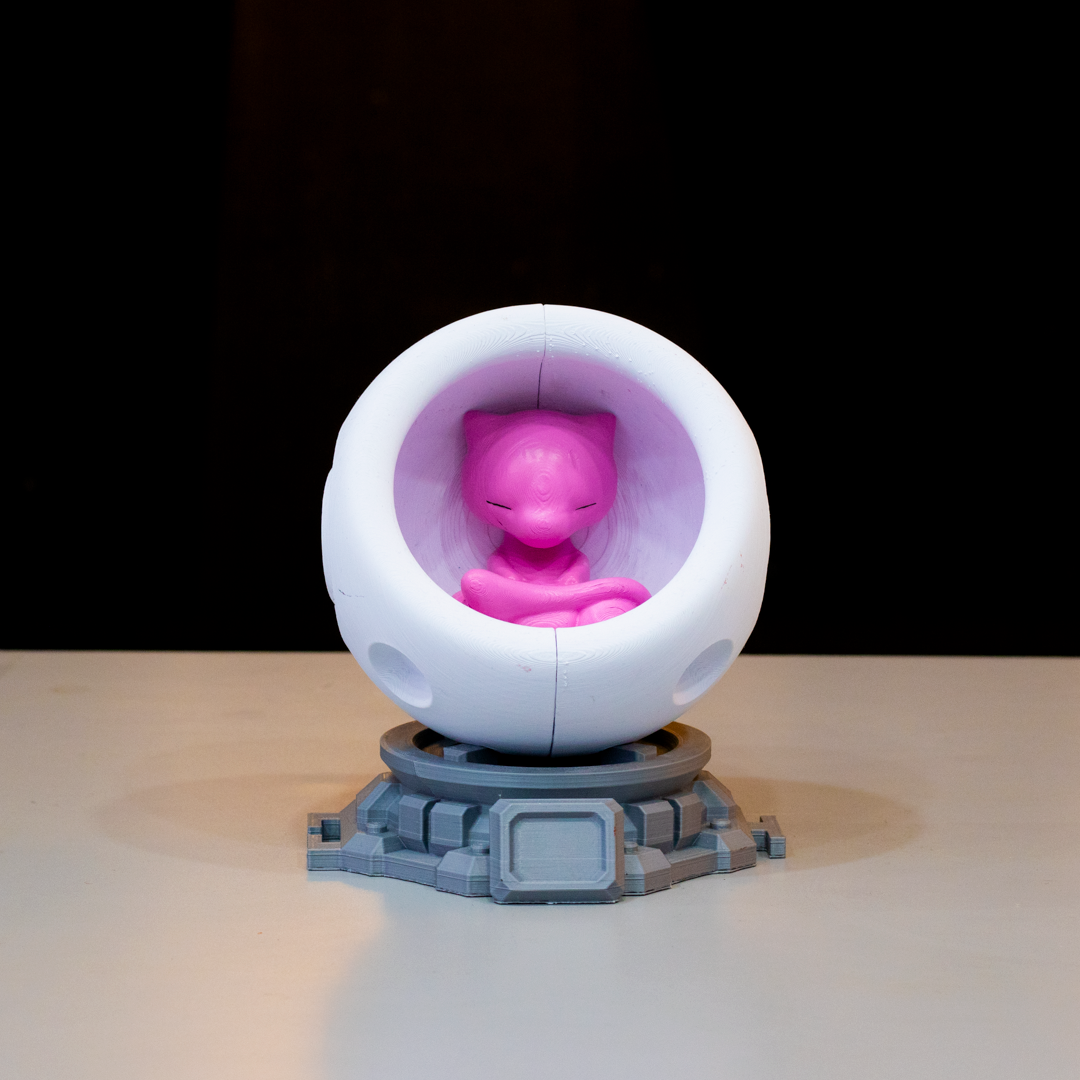 Esta cápsula 3D de Mew captura la esencia del Pokémon más enigmático y adorable del universo Pokémon. Su diseño resalta la elegancia y pureza del legendario Pokémon psíquico flotando dentro de una cápsula iluminada, evocando su poder ancestral y su ternura inigualable.