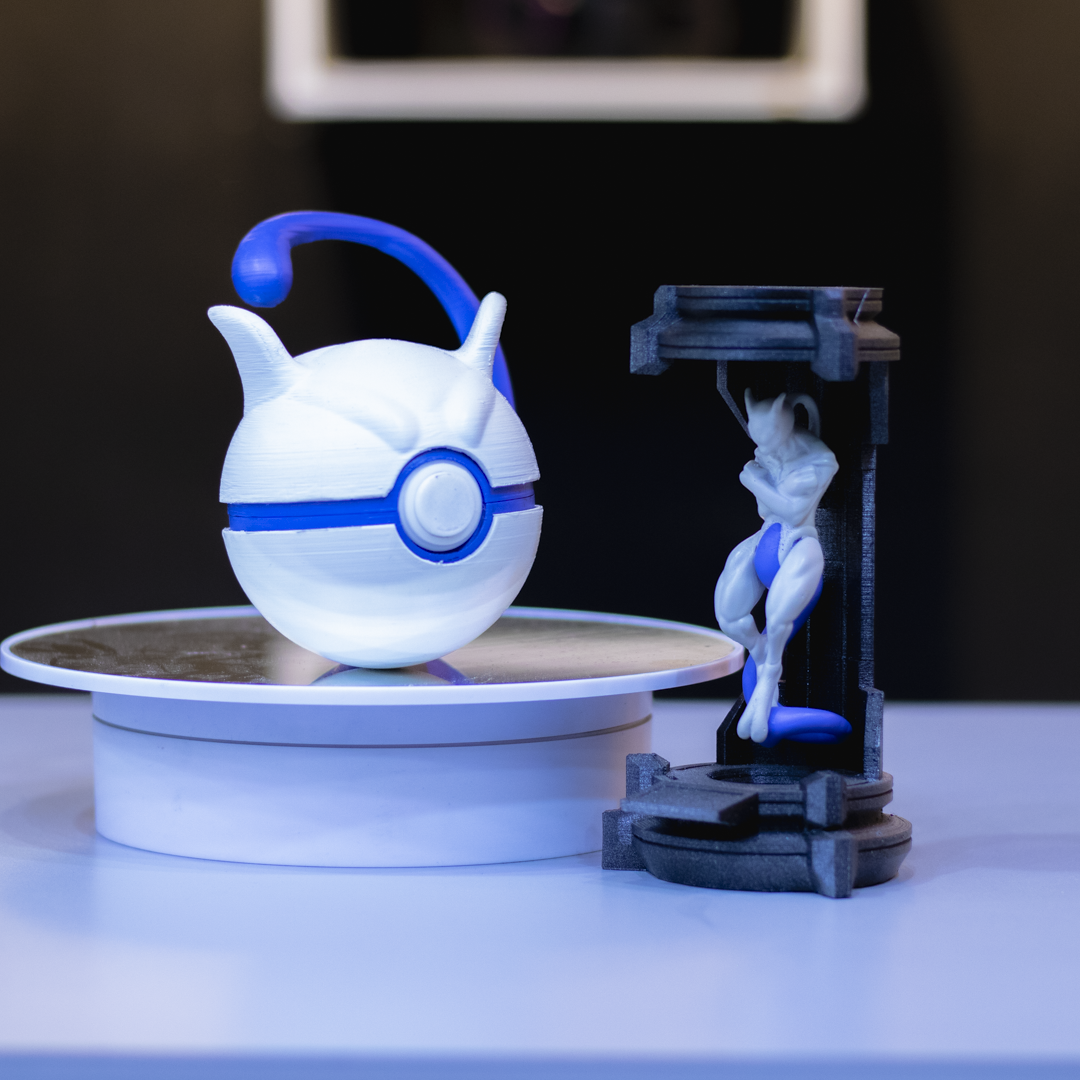 Con un diseño detallado y una Pokébola que completa la escena, esta pieza captura la esencia del Pokémon más enigmático y poderoso, listo para descansar antes de su próxima batalla.