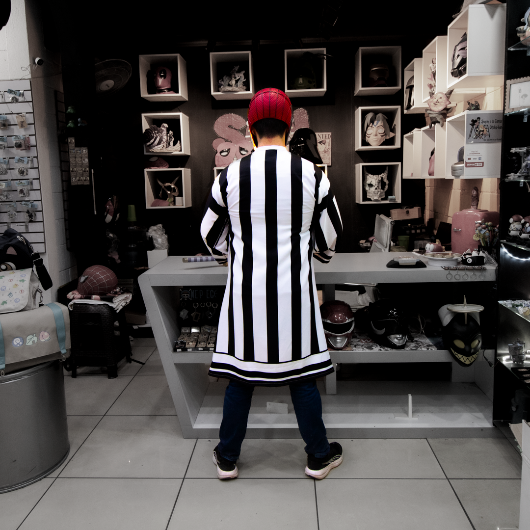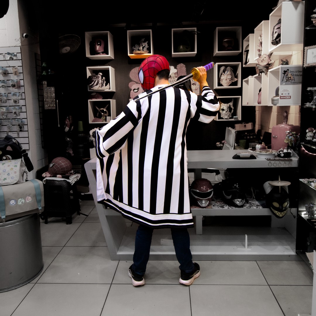 Este haori inspirado en Obanai Iguro de Kimetsu no Yaiba recrea el característico diseño a rayas en blanco y negro del Pilar de la Serpiente, reflejando su disciplina y misterio. Una prenda única que combina sobriedad y poder, ideal para cosplay, exhibición o colección.