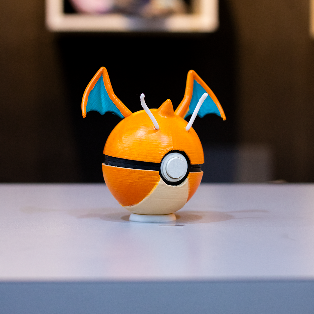 Pokebola inspirada en el pokemon Dragonite, Impresas en 3D, funcionales para abrir y cerrar de 10 cm de diámetro de la parte esférica.