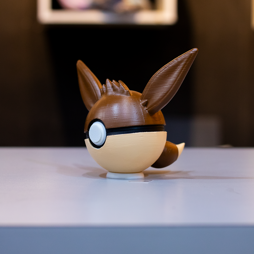 Pokebola inspirada en el pokemon Eevee, Impresas en 3D, funcionales para abrir y cerrar de 10 cm de diámetro de la parte esférica.