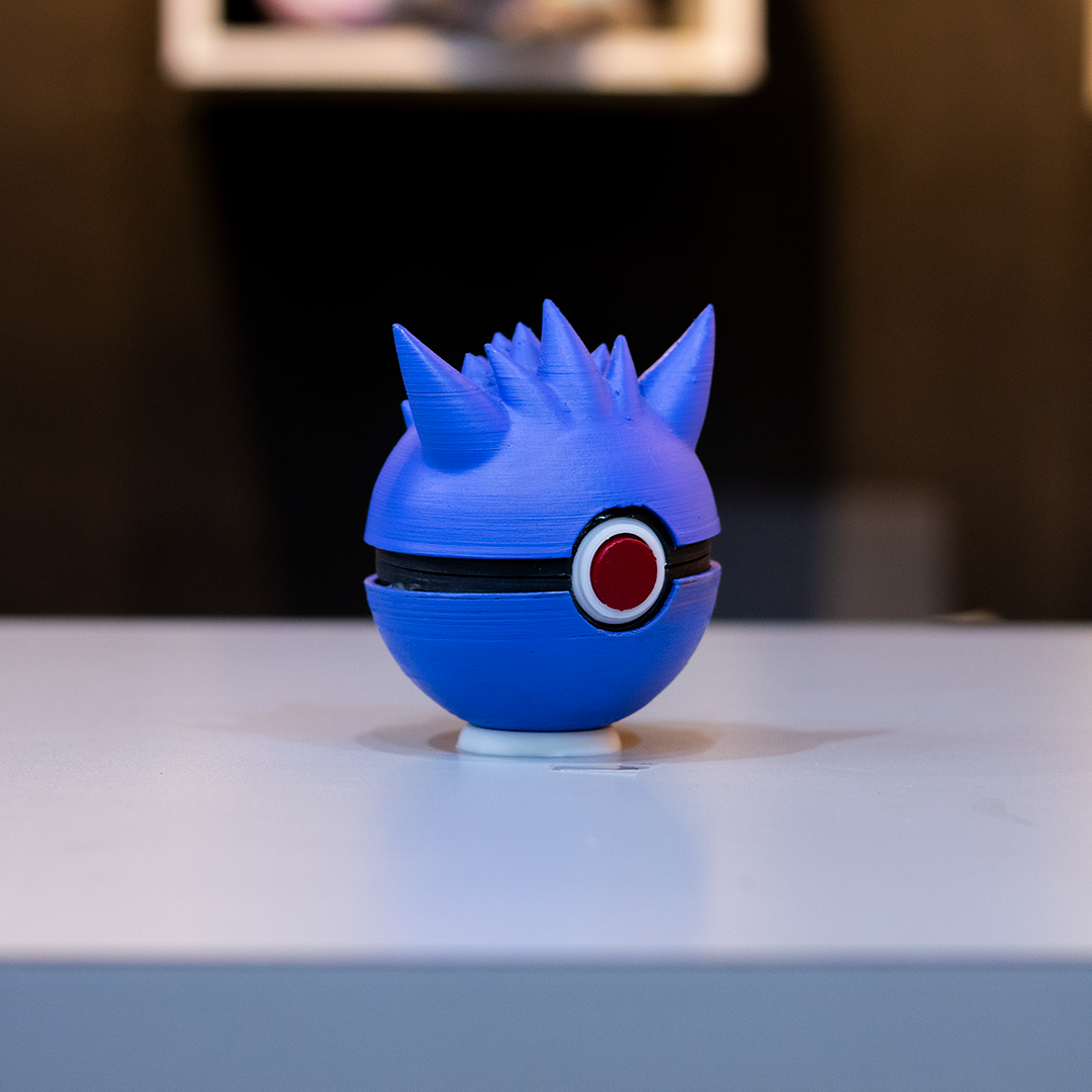 Pokebola inspirada en el pokemon Gengar, Impresas en 3D, funcionales para abrir y cerrar de 10 cm de diámetro de la parte esférica.