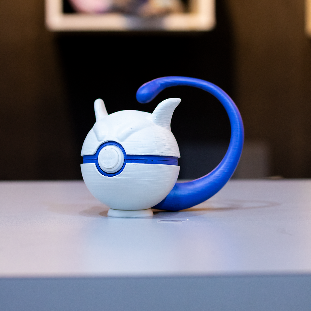 Pokebola inspirada en el pokemon Mew Two, Impresas en 3D, funcionales para abrir y cerrar de 10 cm de diámetro de la parte esférica.