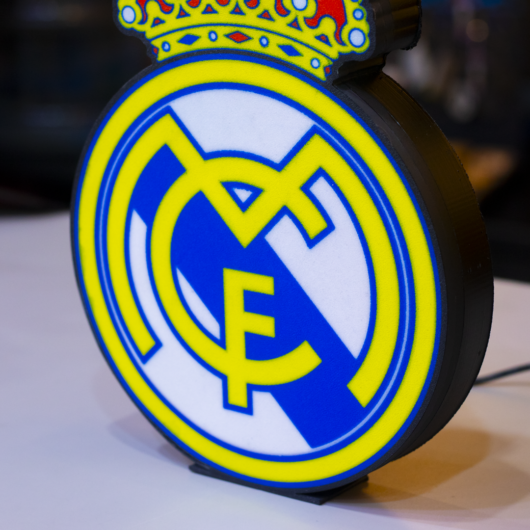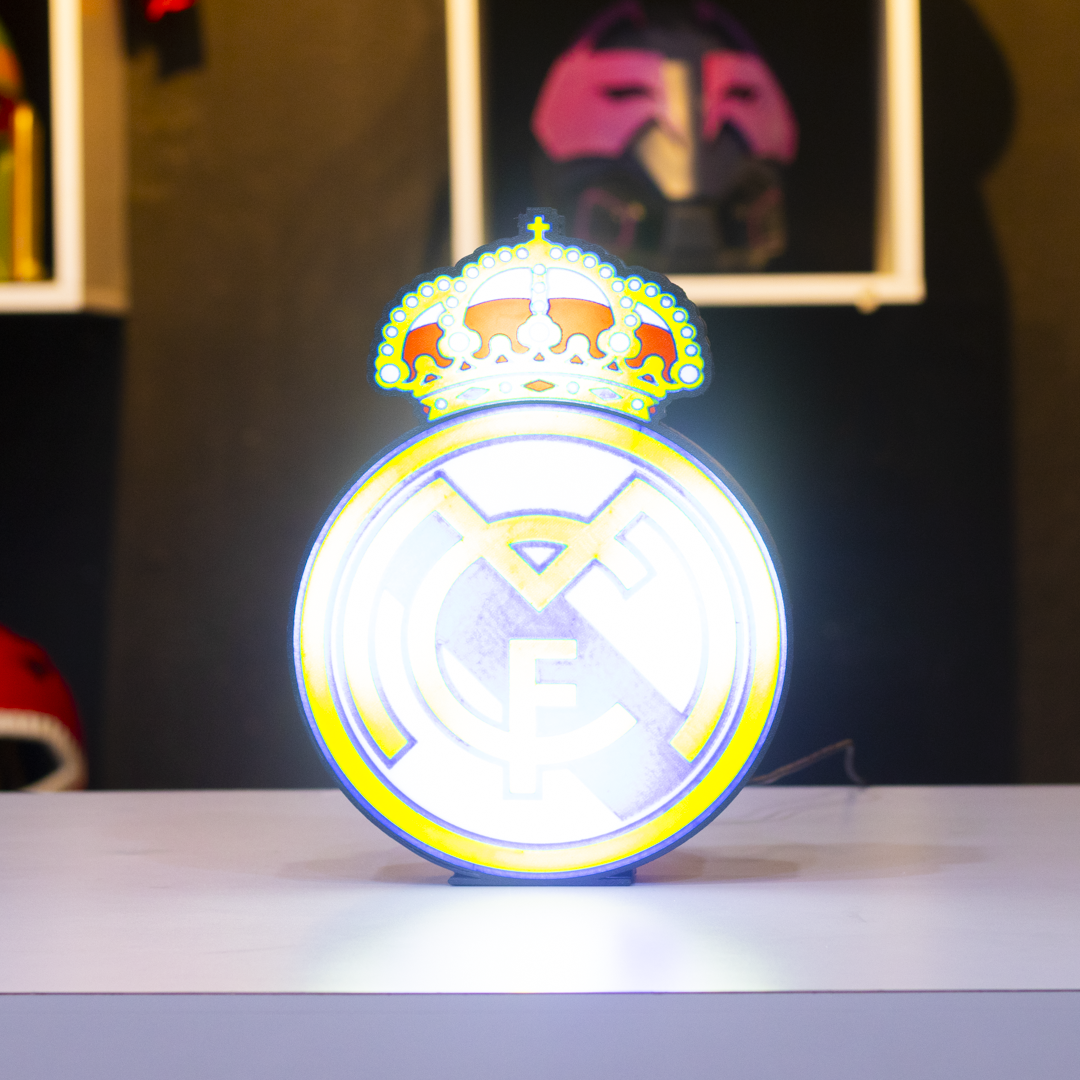 Luz, elegancia y espíritu ganador. Esta lámpara impresa en 3D, inspirada en el escudo del Real Madrid C.F., es perfecta para los verdaderos merengues que quieren llevar su pasión futbolera a todos los rincones de su hogar.