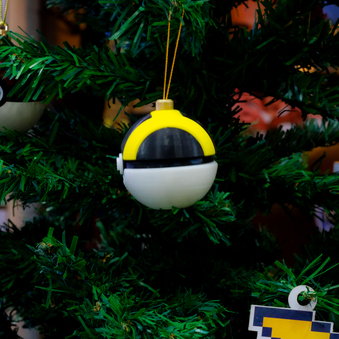 Esfera navideña inspirada en la Ultra Ball de Pokémon ⚡🎁, con colores vibrantes y un acabado brillante que refleja la esencia de los mejores entrenadores 🌟🐾.