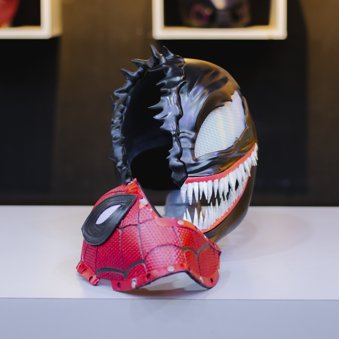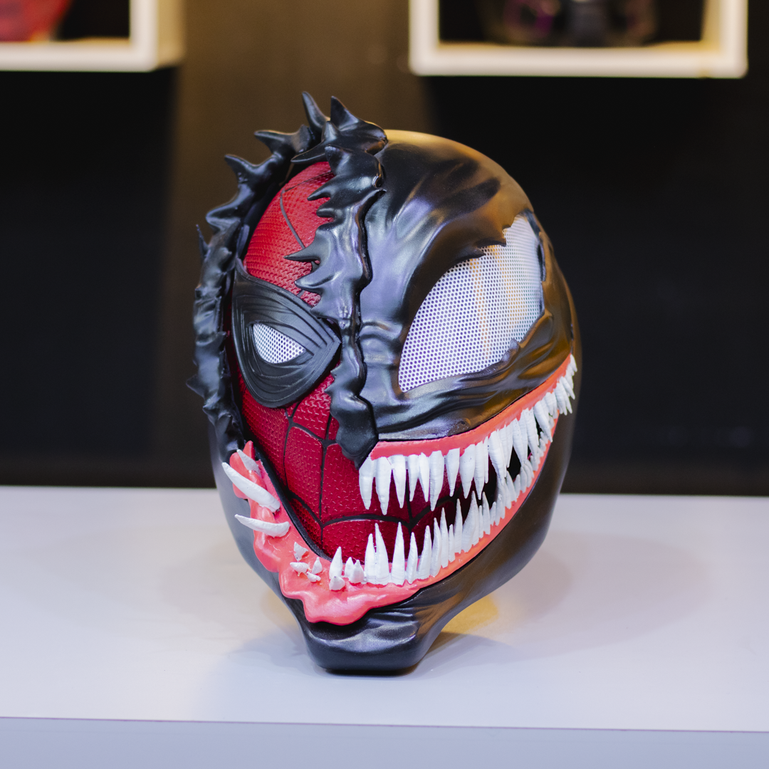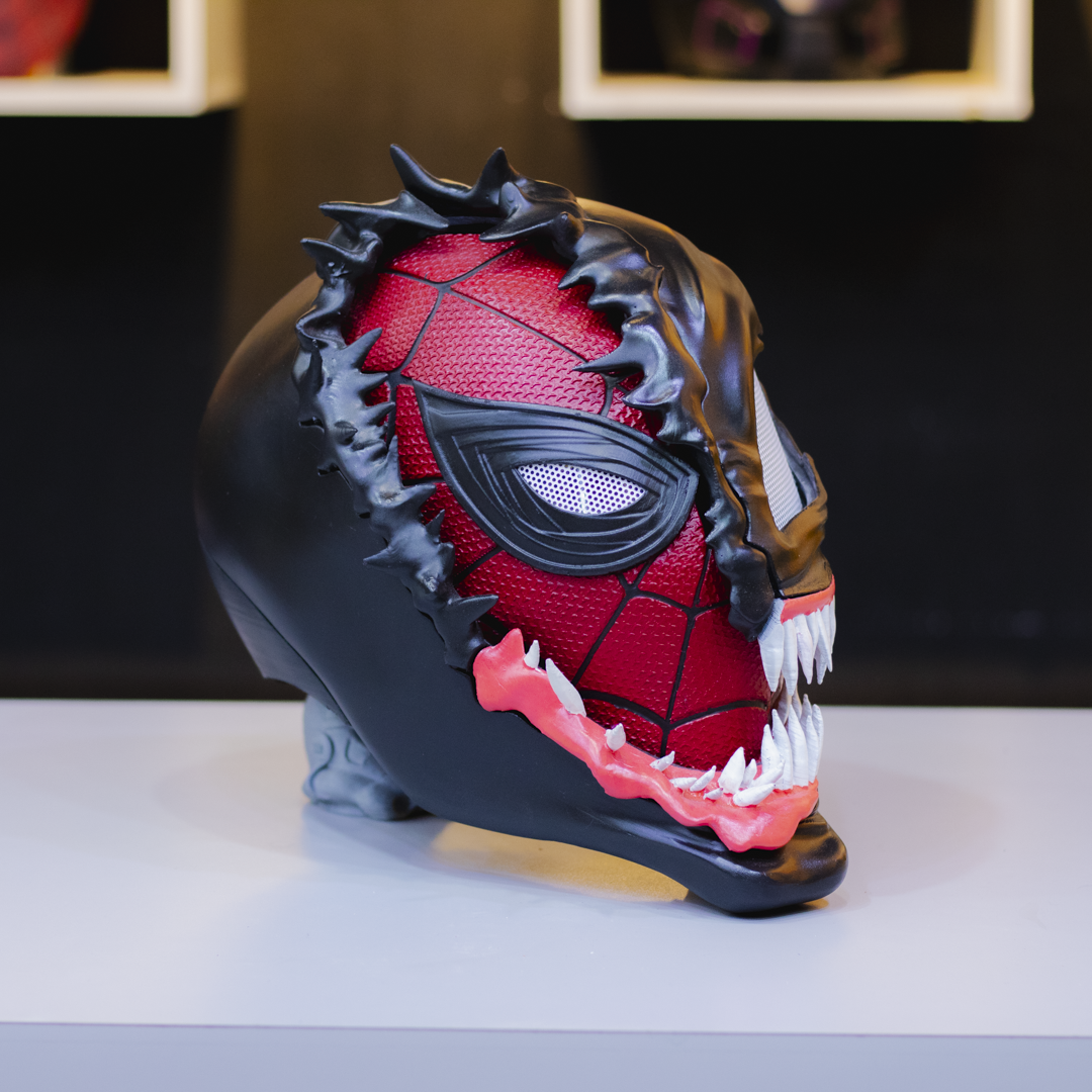 Este casco de Venom con media máscara de Spider-Man desmontable te permite alternar entre el simbionte letal y el amistoso vecino arácnido en un solo movimiento.